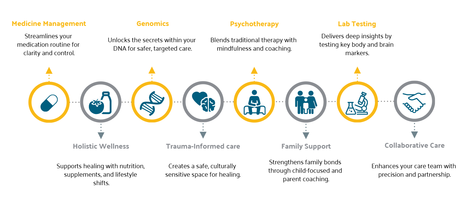 • Mental health isn’t trial and error. We use advanced DNA testing (IntellxxDNA) to uncover how your unique biology affects your mood, energy, focus, and medication response. It helps us get it right sooner—so you can feel better, faster, with less guesswork.
